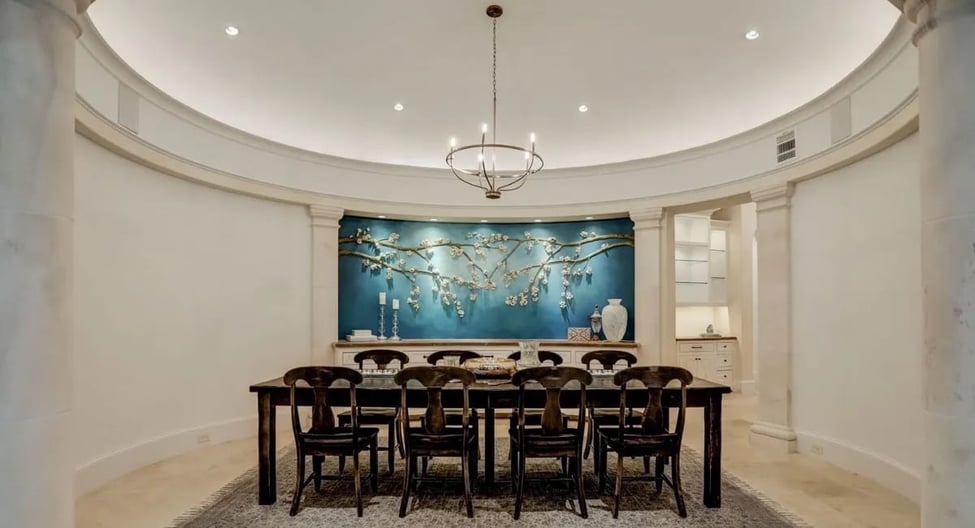 This majestic Houston estate is a bastion of elegance indoors and out. Its impressive backyard is an alluring oasis with a veranda, a summer kitchen, a pool and spa, and a pool house. The 11,585-square-foot interiors include a great room, a wine vault, a game or media room, a study, day-to-day and catering kitchens, and six bedrooms. The distinctive circular dining room features a striking domed ceiling, a built-in stone-topped buffet, a lovely hand-painted wall, and a view of a courtyard fountain.