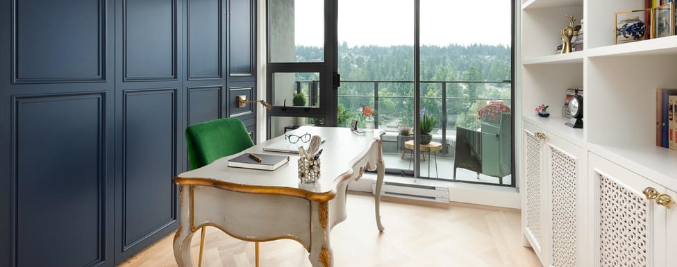 When it comes to corporate spaces, colour has been employed to signal who a brand is and why. When it comes to space in your home, colour is less about who you’re working for and more about how you want to feel while you work. Classic colour theory can stand you in good stead—if your work involves dynamic decision-making or constant motion, brighter, vibrant colours can invigorate your space; if prolonged concentration is the order of your days, muted blues and whites can create a calming, uninterrupted milieu. Trending choices like matte black and moody brown (best used as an accent on one wall) can add formality and authority to your workspace. Wallpaper and large-scale decals have also come into vogue in recent years, meaning that you can work in an enclosed space surrounded by birch trees or amongst the tropical leaves. Graphic prints and modern florals—even if only incorporated on pillows or throws—mean there’s no reason to default to office beige.