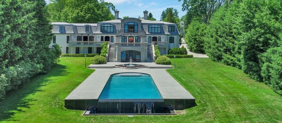 A bastion of dazzling Old World refinement, this regal four-bedroom 9,718-square-foot manor is replete with elegant details and generous spaces for genteel living and entertaining. The 2.36-acre property includes a swath of lush lawn, a sandy beach, a tennis court, multiple levels of terraces—one with a classical fountain—and an infinity-edge pool, all perfect for relaxing while appreciating views of the sparkling waters and glimpses of boats as they sail by on Long Island Sound.